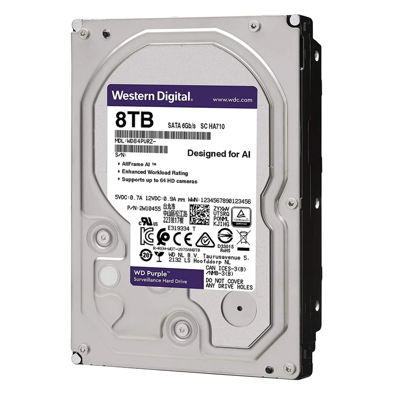 Western Digital WD84PURZ یک هارد دیسک از سری WD Purple است که برای محیطهای ضبط ویدئوی نظارتی طراحی شده و قابلیت عملکرد ۲۴×۷ را داراست. با ظرفیت بالا (۸ ترابایت)، حافظه پنهان مناسب (۱۲۸ MB)، فناوری AllFrame برای جلوگیری از افت فریم و پایداری بسیار بالا، مناسب سیستمهای DVR و NVR حرفهای با بار کاری بالا محسوب میشود. همچنین این هارد قادر است تا ۶۴ دوربین HD را در سیستمهای NVR پشتیبانی کند.