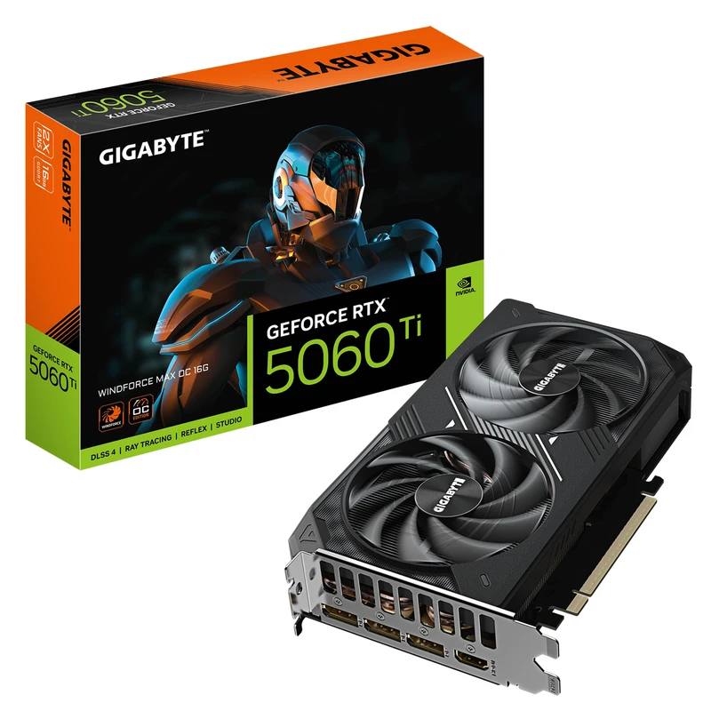 کارت گرافیک گیگابایت مدل GeForce RTX 5060 Ti WINDFORCE MAX OC 16G مجهز به ۱۶ گیگابایت حافظه GDDR7 روی باس ۲۵۶ بیت با سرعت ۲۸ گیگابیت بر ثانیه است که پهنای باند بالا برای رزولوشنهای 1440p/4K و بافتهای پیچیده فراهم میکند. کلاک بوست اورکلاک MAX کارخانهای تا ۲۶۷۰ مگاهرتز (یا بالاتر) و ۱۰۷۵۲ هسته CUDA، قدرت پردازشی نزدیک به RTX 5070 Ti نسل قبل ارائه میدهد.